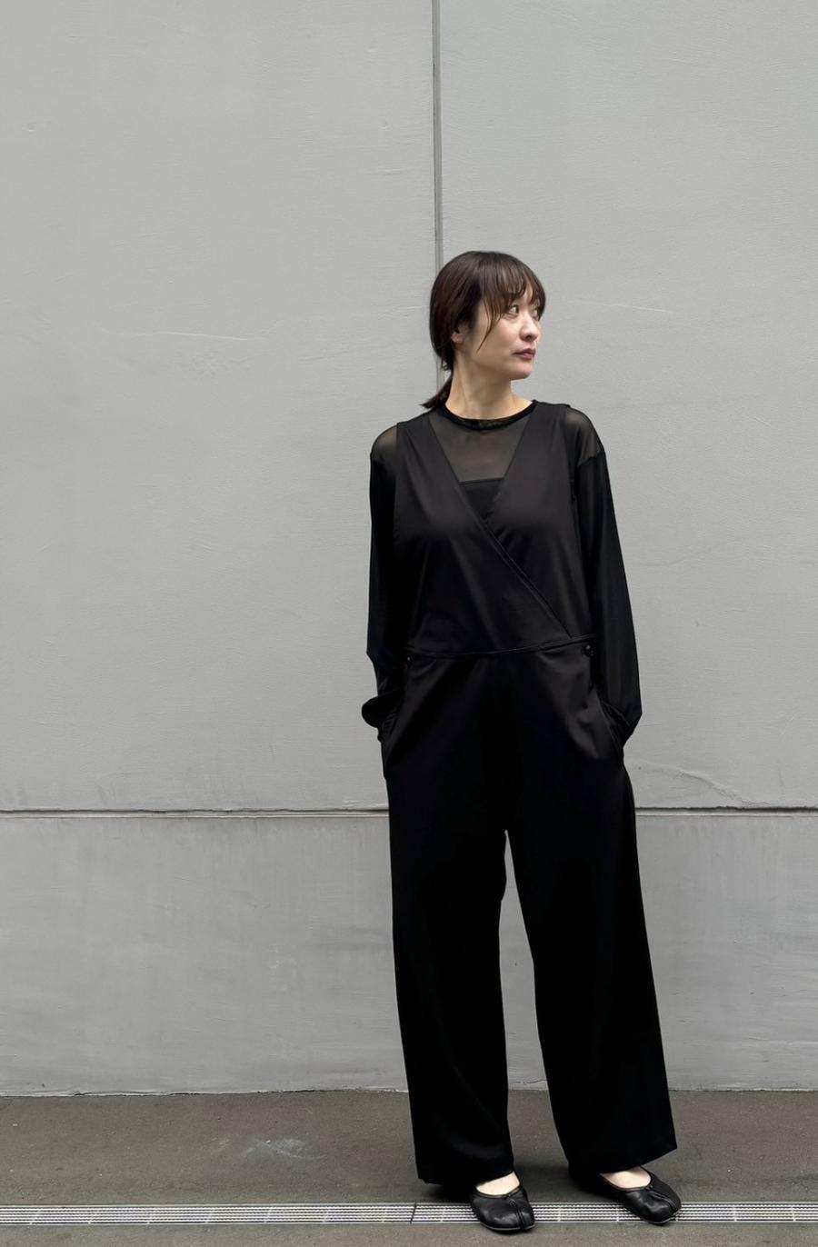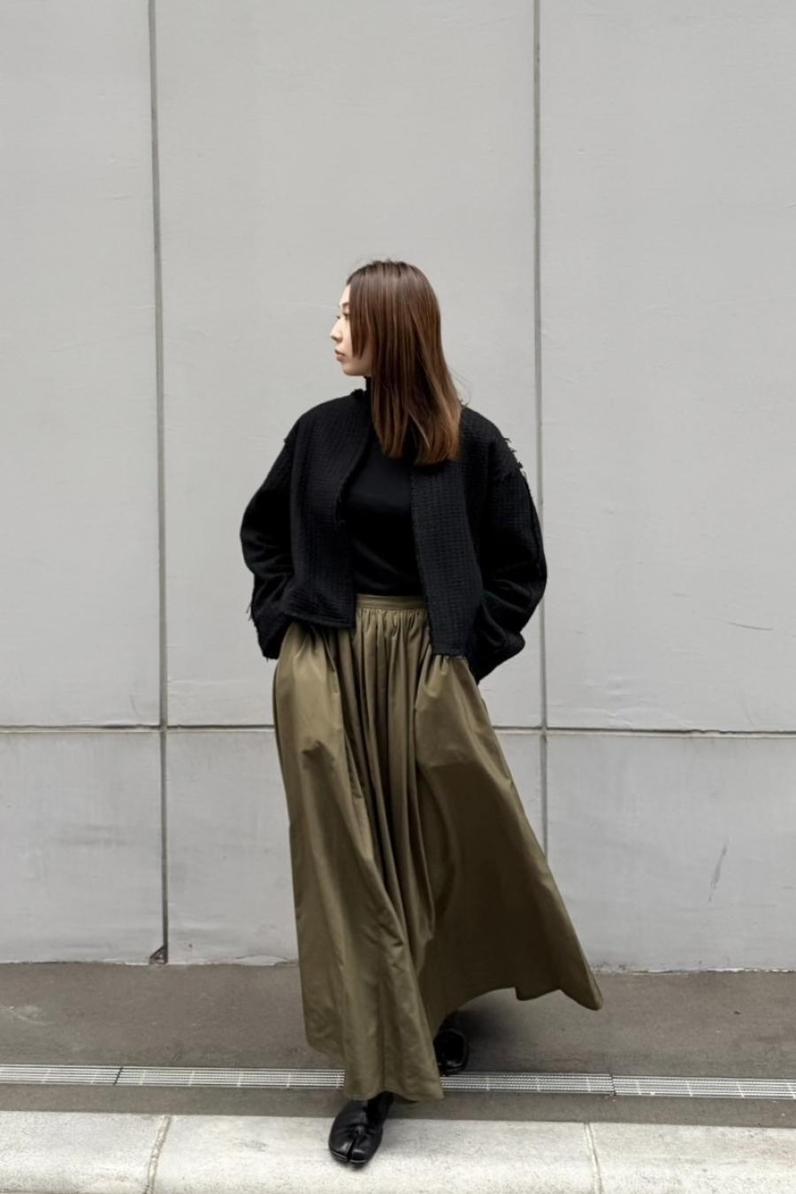 表に出した特にアクセントとなる丸みのあるヘムライン(裾の形)がポイントで、前後で着丈の長さを変えたスッキリ見えるシルエット。